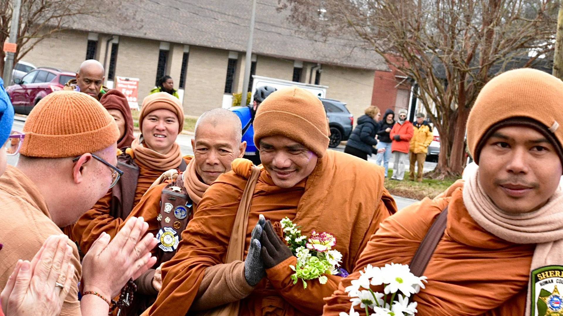 The Walk For Peace in North CarolinaOn January 17th, Dr. Lye and members of Urban Dharma joined many others in Salisbury & Spencer, North Carolina, to pay respects to the monks undertaking the Walk for Peace from Fort Worth, Texas to Washington, DC. Dr. Lye shares some explanations of the tradition these monks are practicing: “Thudong” is Thai/Lao for “dhutanga” – a set of 13 ascetic practices that the historical Buddha recommended and allowed for his disciples. Dhutanga practices include strict adherence to the monastic rules (not handling money, not eating after noon, not physically engaging those of opposite gender), living in forests, caves or outdoors, wearing patched robes, eating only alms food in a single bowl, carrying minimal possessions (bowl, razor, kettle, umbrella with mosquito net) and walking long distances on foot.